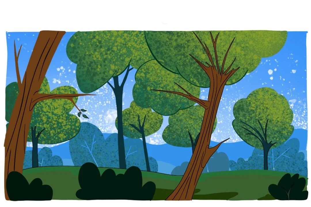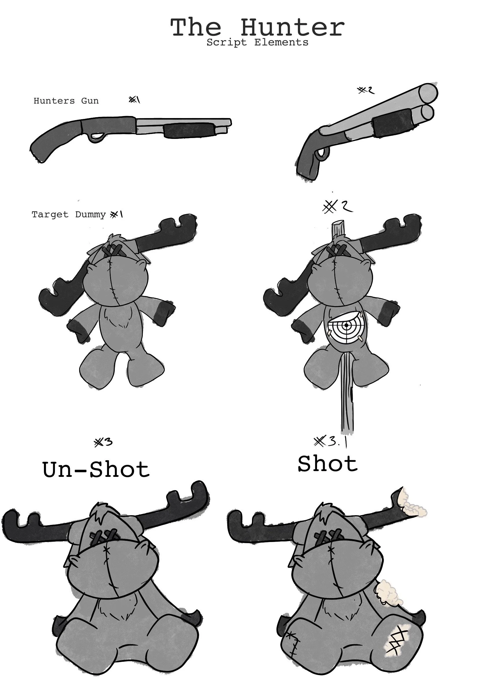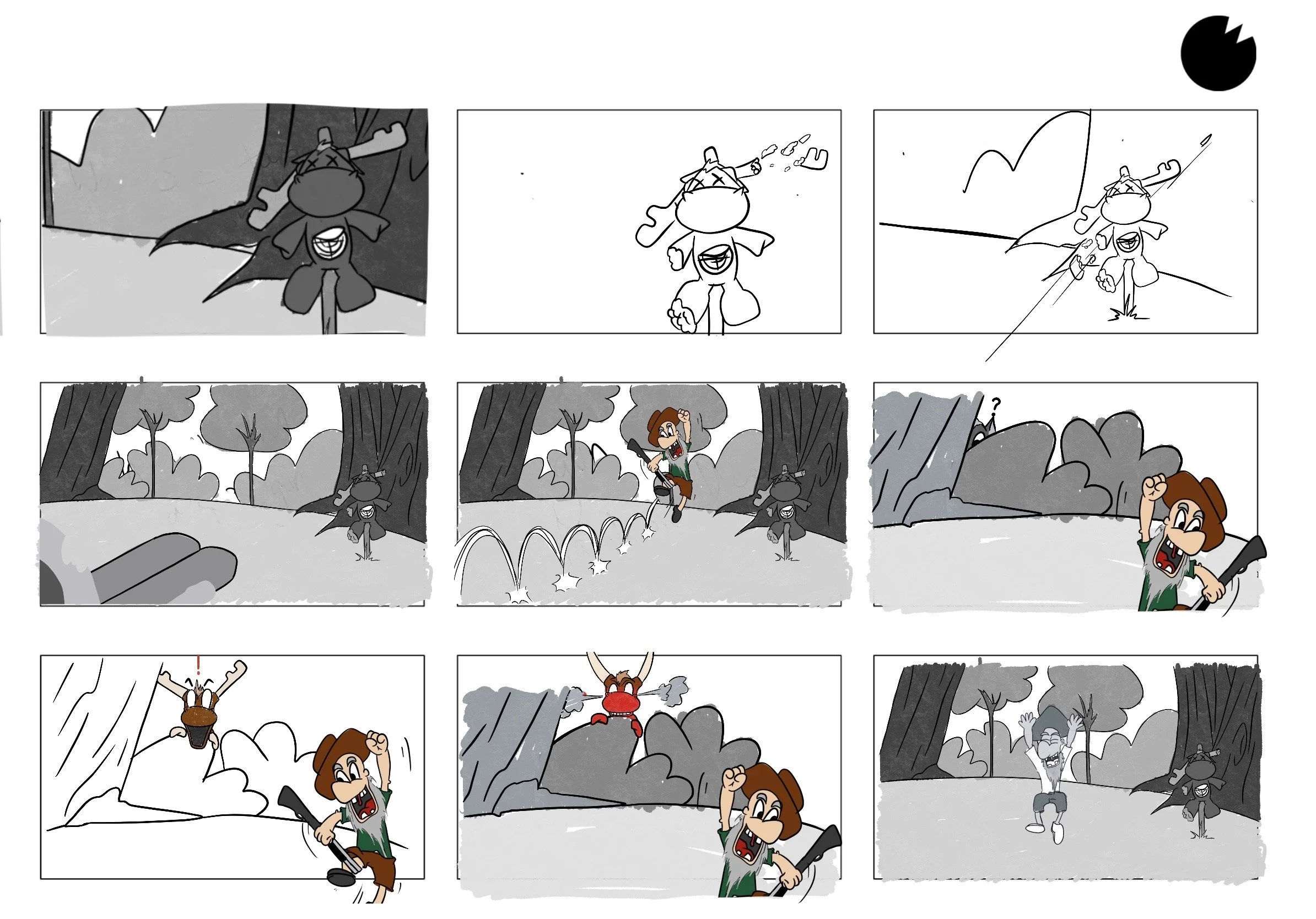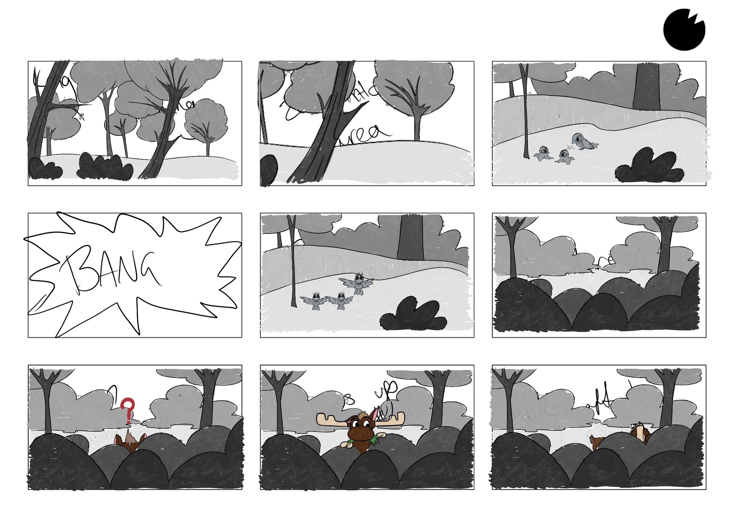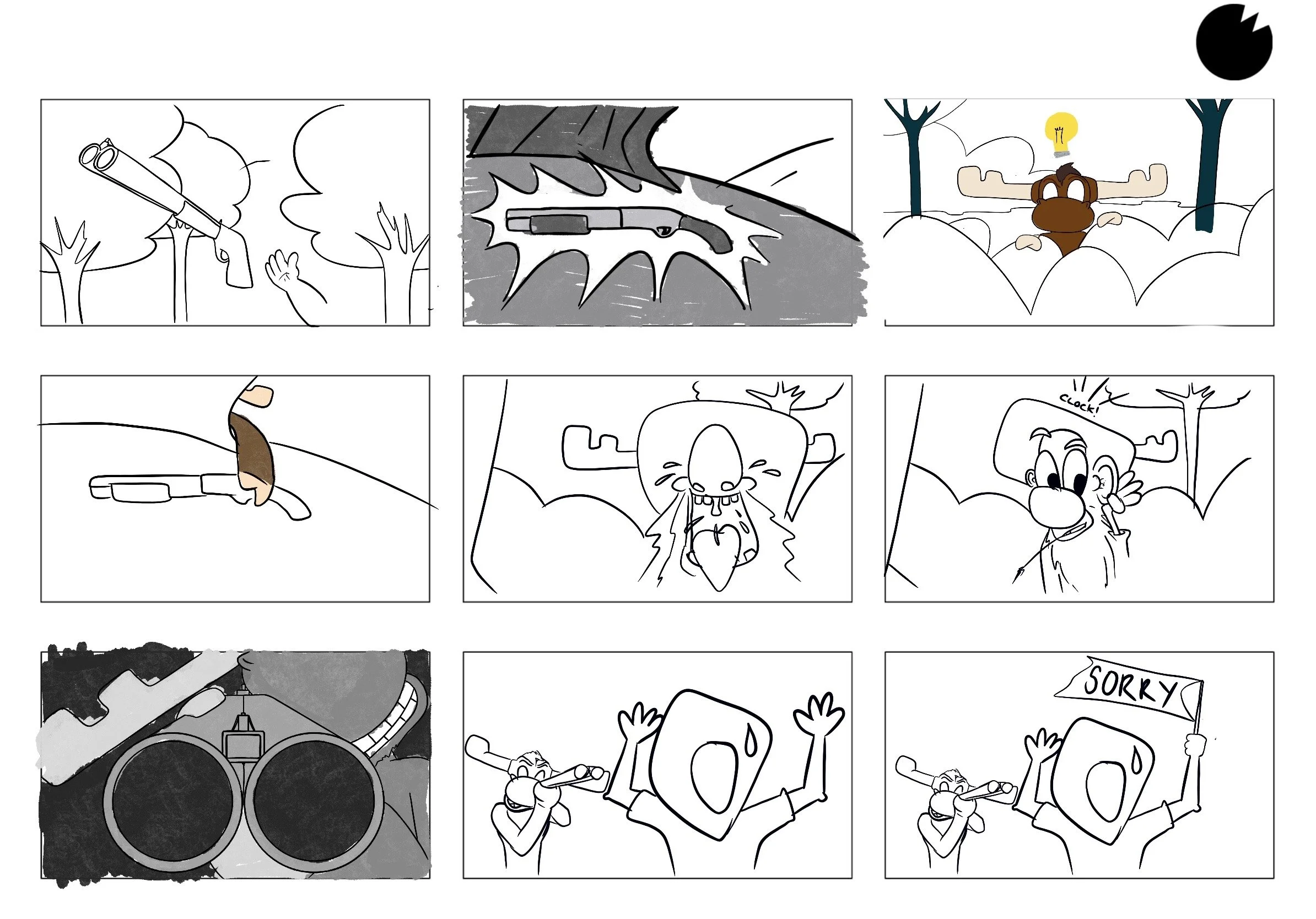 sketches and frames from my animatic for short film Moose & Hunter